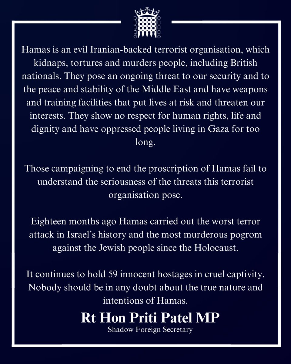 Eylon Levy @eylonalevy · Twitter · 2025-04-09 17:21 UTC Powerful moral clarity from @pritipatel and the Conservative Party. Hamas is an evil regime that violates every norm and value that the British people hold dear. Hamas should not be legalized. It should be crushed. • Priti Patel MP @pritipatel · Twitter · 2025-04-09 16:58 UTC