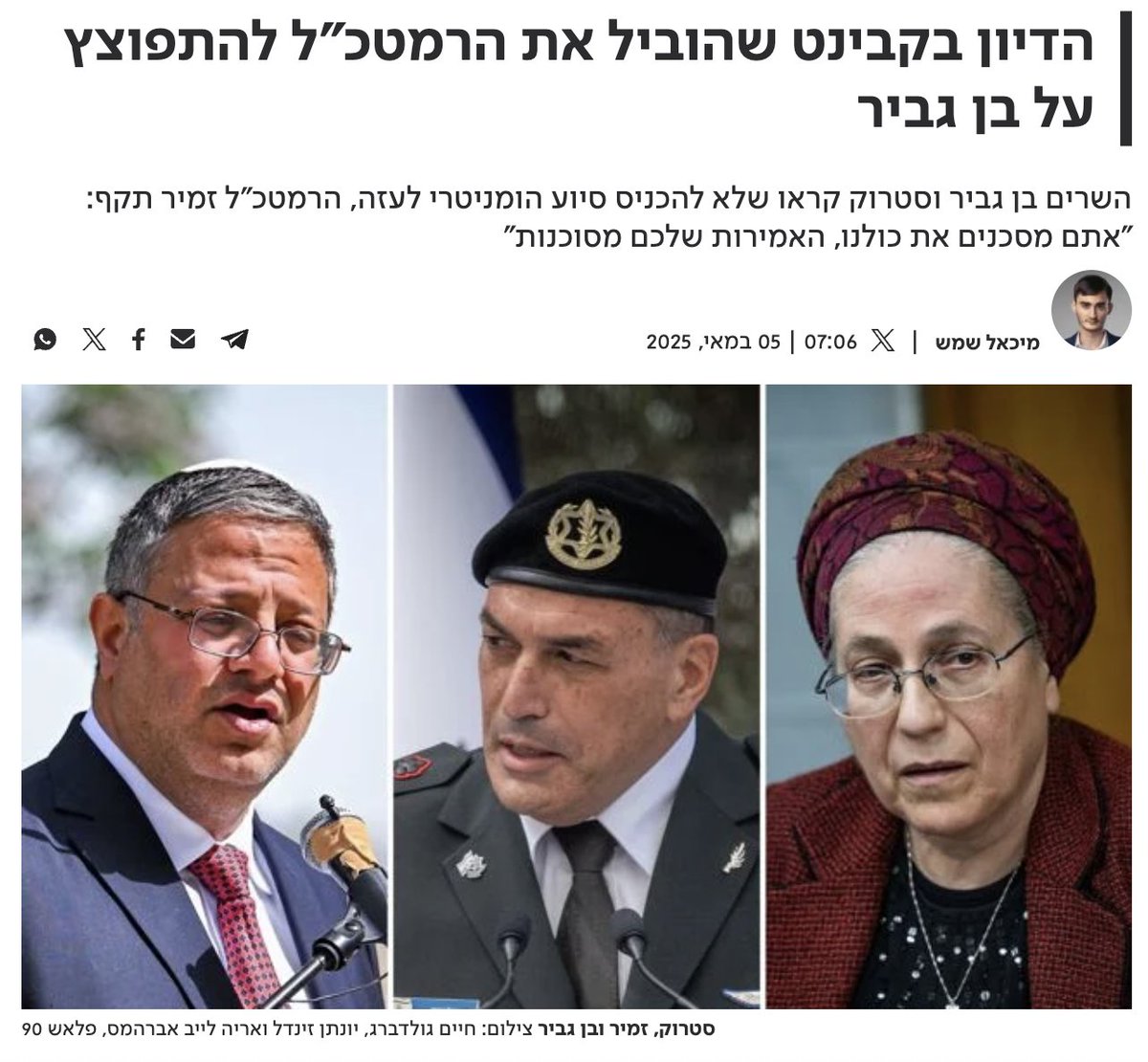 The IDF Chief of Staff reportedly shouted at Otzma ministers Ben-Gvir and Strok: "You don't understand what you're saying. You're endangering us all. There's international law, we're obligated to it. You can't starve the Strip. Your statements are dangerous." via @shemeshmicha