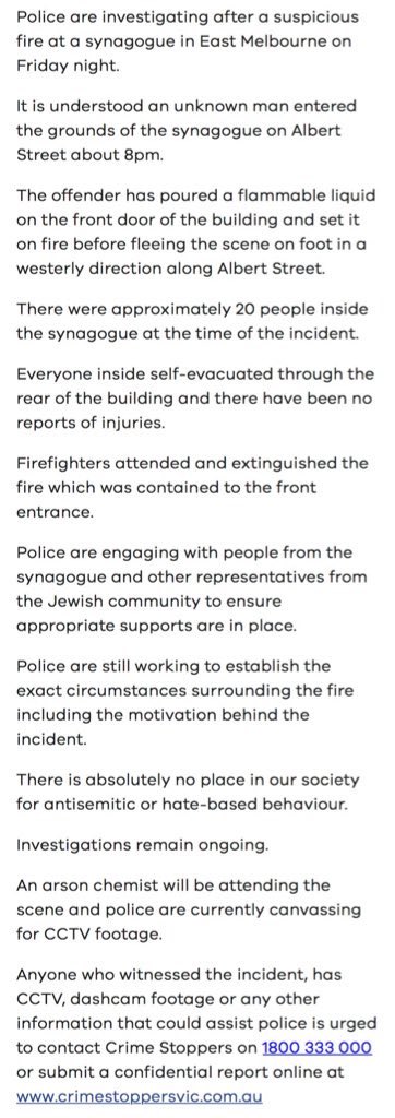 Revolting. A man set fire to the entrance of a synagogue in East Melbourne last night, during Shabbat, while people were inside. @3AW693