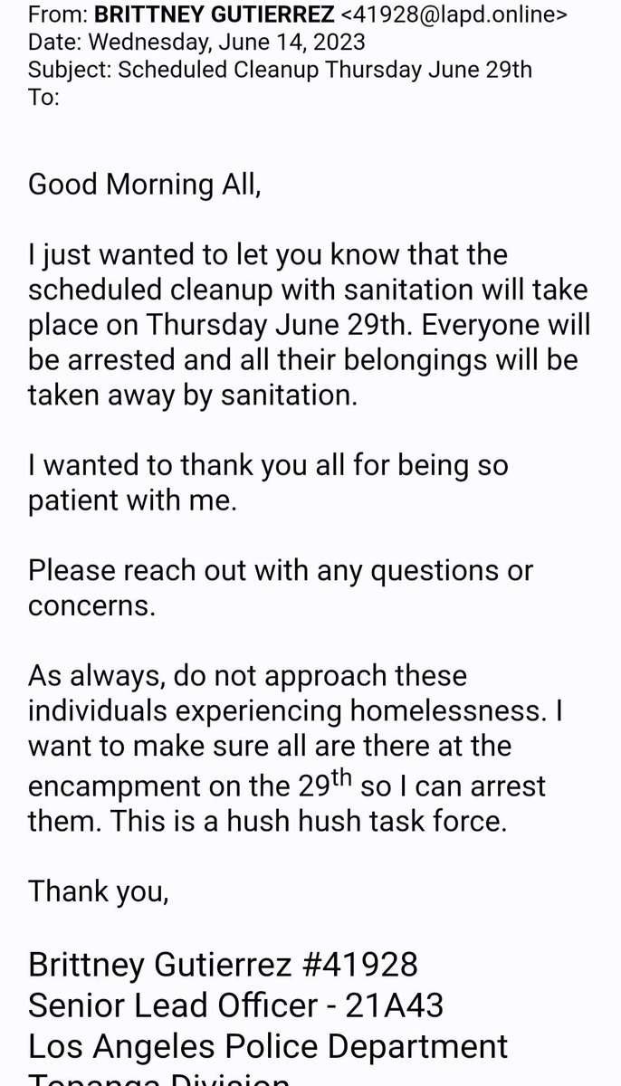 • Film The Police LA @filmthepolicela · Twitter · 2023-06-27 18:54 UTC If this email is legit, the LAPD is planning to arrest homeless on Thursday June 29th in Woodland Hills by a “hush hush task force”. This language sounds like they’re trying to herd & trap homeless. Wild language.