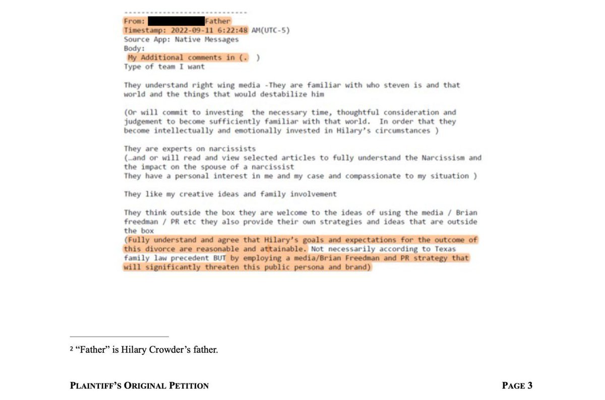 PER HILARY’S FATHER in Hilary’s group text thread, here is a message liked by Hilary. The extortion scheme involved assembling a team to "destabilize" Steven.