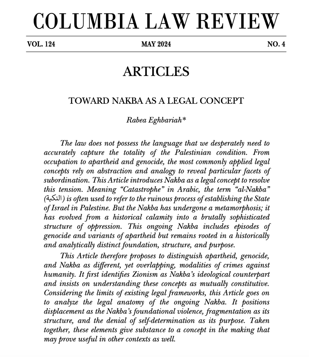 Columbia Law Review publishes Toward Nakba as a Legal Concept: "Legal theory still lacks an adequate analytical framework to describe the reality of domination and violence in Palestine." https://columbialawreview.org/wp-content/uploads/2024/06/May-2024-1-Eghbariah.pdf