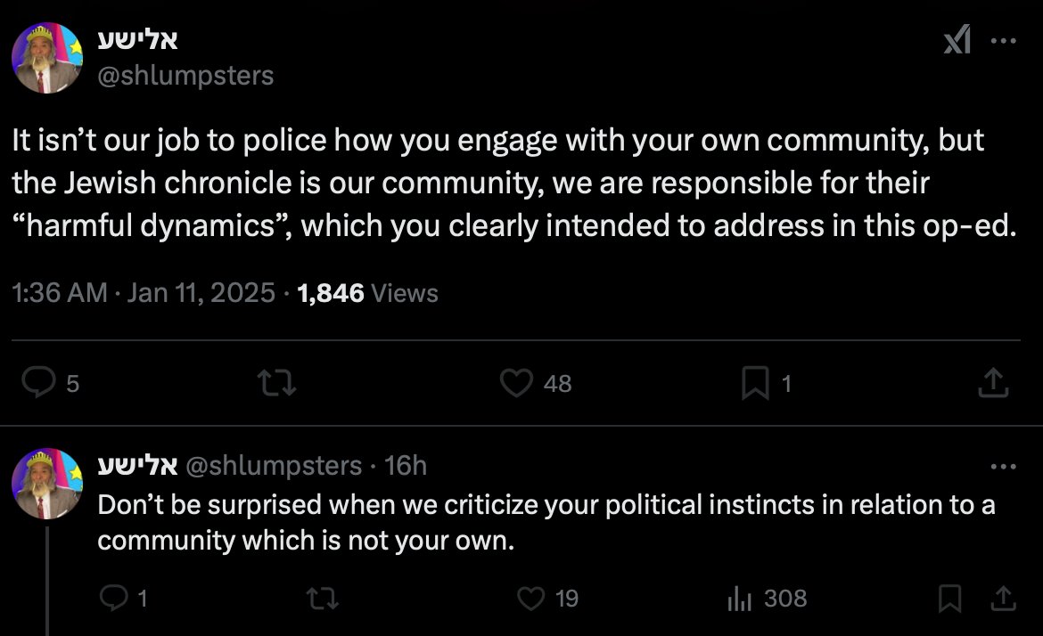 Ahmed, I'm sorry. As any Jew will tell you, Jews can be a royal pain. Especially the self-righteous ones. Why does a Palestinian - an actual Gazan with skin in the game - have to face harassment and idiotic gatekeeping from loudmouth "progressive" Jews when he tries to speak to Jewish communities? How dare you gatekeep, you who represent almost no other Jews but yourselves? Feel free to disagree with him, feel free not to read him, but the idea that a Palestinian should be harassed for the crime of speaking to the mainstream majority of Jews - is a weirdly counterproductive form of erasure of those Jews. And when a Jew does it, like this clown in the screenshot for example, it's only adds the insult of self-abnegation to the original bigotry.