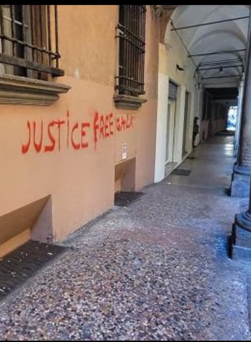 Synagogue in Bologna (Italy) vandalised. The mayor of the city @matteolepore (below right) displaying the Palestinian flag from the balcony declared: ‘When international law is fully restored, we will also display the Israeli flag next to the Palestinian flag’.