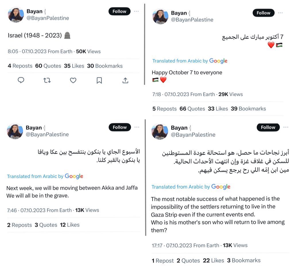 Haviv Rettig Gur @havivrettiggur · Twitter · 2025-01-16 16:40 UTC And @CNN and @BBC used her reportage happily and uncritically. Michael Elgort @just_whatever · Twitter · 2025-01-16 00:24 UTC A gentle reminder Bayan openly celebrated October 7 on October 7 She is a pro-Hamas stooge and shall be treated as such