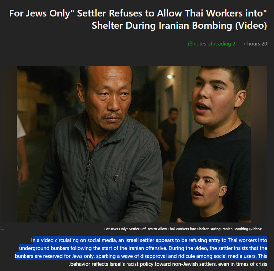 The antisemitic blood libels are coming fast and furious. Arabic media and social media are claiming there is a video where an Israeli Jew prevents Thai workers from a bomb shelter because it is for "Jews only." In fact, he was begging them to come IN to shelter.