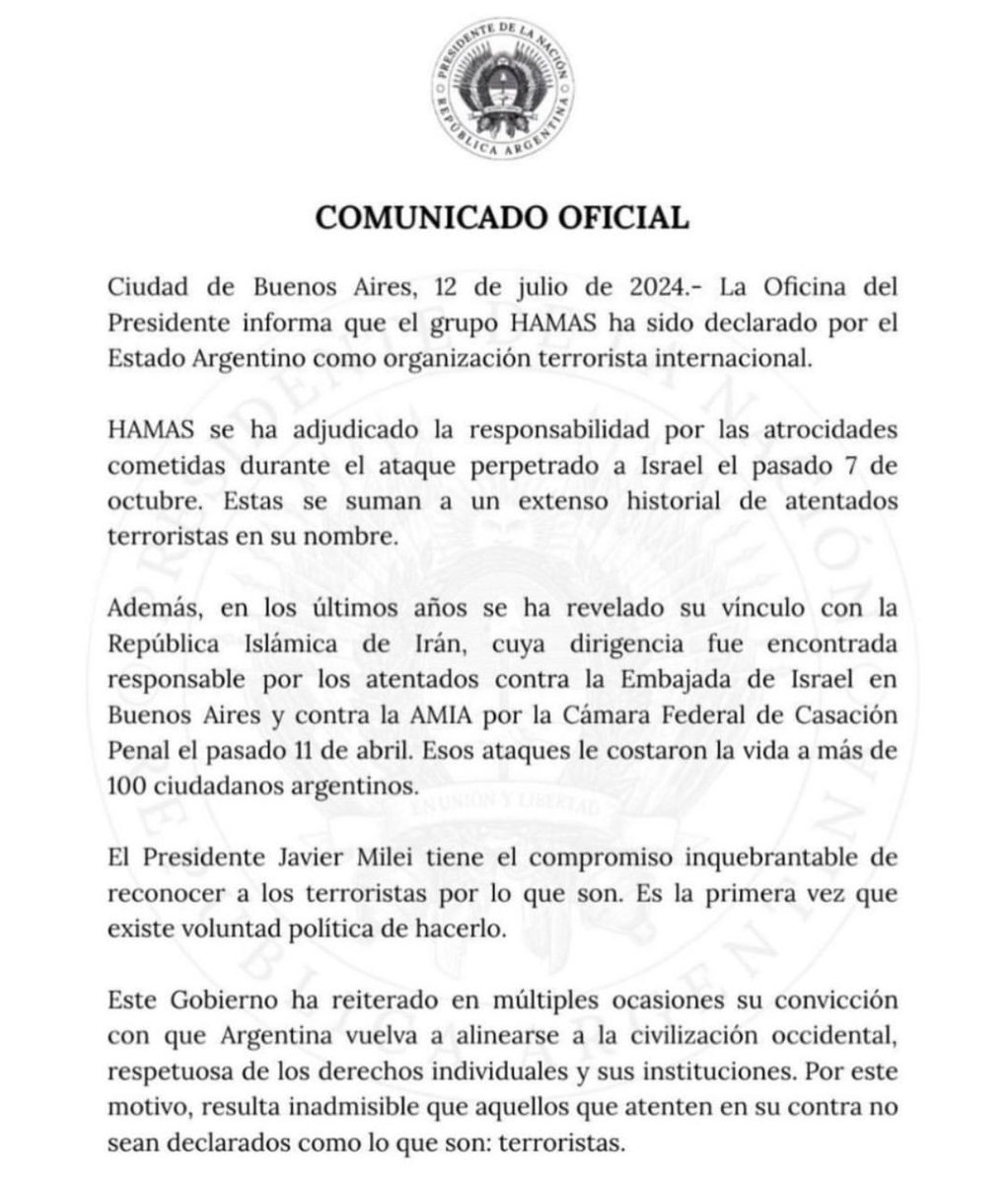 Hen Mazzig @henmazzig · Twitter · 2024-07-13 06:44 UTC BREAKING: it’s official, Argentina is the first South American country to designate Hamas a terrorist organization.
