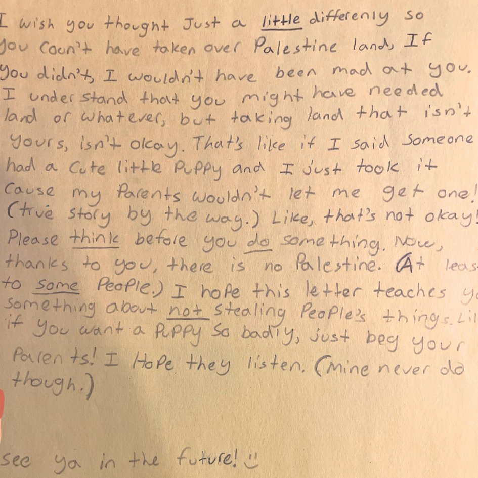 Letter writing assignment and "Hanukah wishlist" from a Hebrew School in Brooklyn, New York. Jewish kids are taught to hate on their ancestors for 'stealing Palestinian land' and to wish for everything but the return of the hostages. The 10-year-old student who wrote that letter, who has family in Israel, reportedly burst into tears when asked about it, as students had been instructed to write this way. The progressive movement should teach kids to celebrate their identities, not tunnel vision on an incomplete and false version of our history.