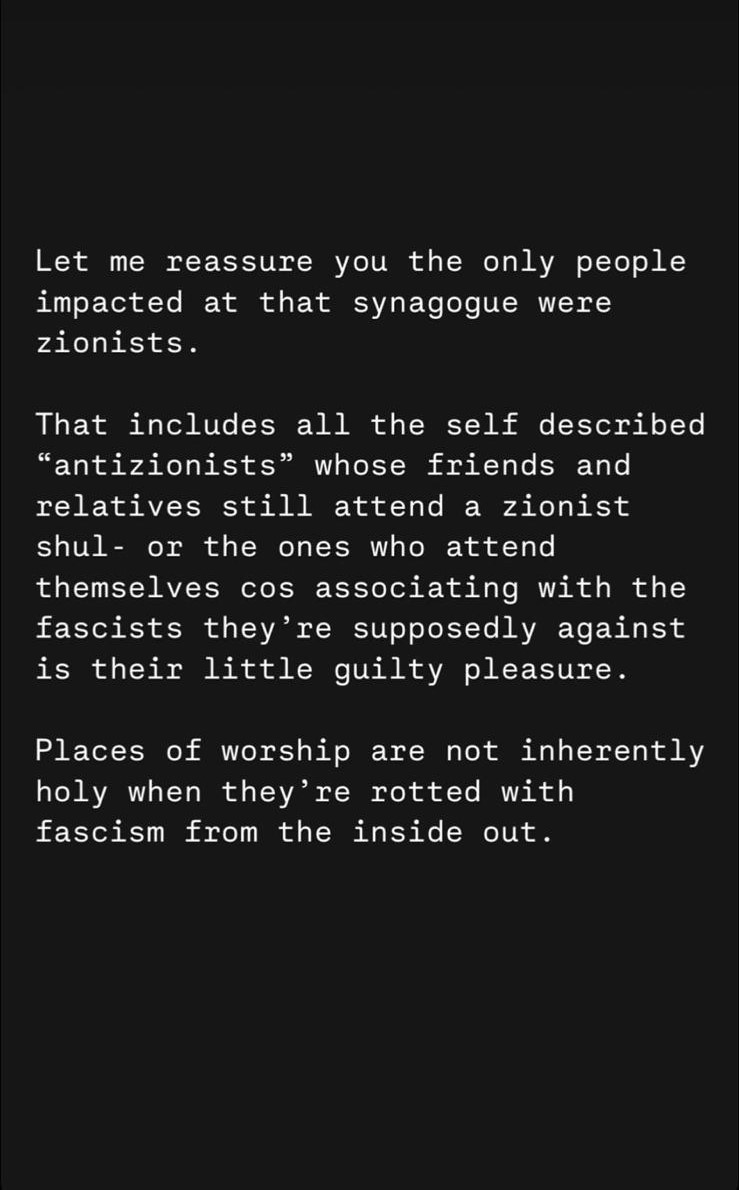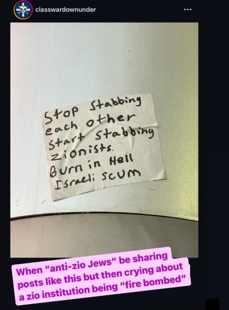 Australian "anti-Zionists" justify a synagogue being burned down, one even saying that "Every Zionist institution should burn" which just so happens to include "every shul inside Melbourne." If you are advocating for every synagogue in Melbourne to burn down you are an antisemite. If your movement considers every synagogue to be "rotted with fascism from the inside out" then you are part of an antisemitic movement. How can a person sit and type that every single synagogue is a legitimate target and people who are "friends with Zionists" or "attend a Zionist shul" deserve to burn alive and not realize how horrible they are being? You are saying you are okay with a human being burned alive if they have relatives who attend a Zionist synagogue. This is the power dehumanization has.