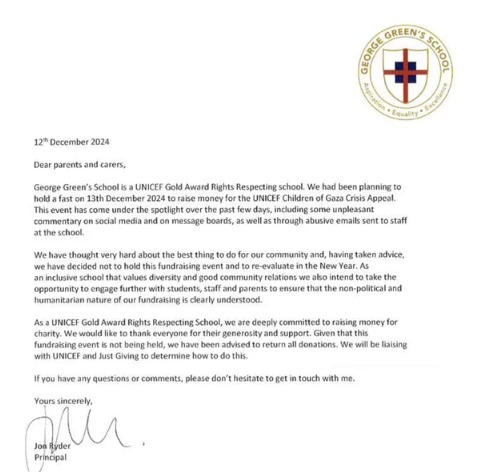 Remember the school that was going to ask their students, most of whom live below the poverty line, to fast "for Gaza?" Well, they've canceled the fast in a way that shows they have no idea what the problem was. They mention abusive emails and unpleasant commentary, but don't