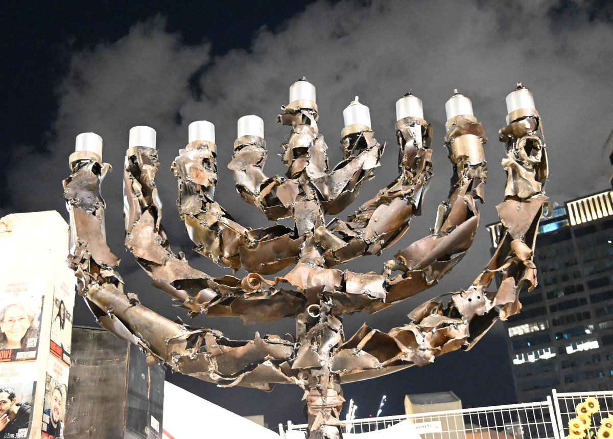 A menorah made from missile fragments—rockets from Lebanon, Iranian ballistic missiles, and UAVs from Yemen—now stands in Hostages Square. Each piece tells a story of survival, transforming darkness into light. Created by artist Eli Gross, it’s a powerful symbol of hope. 📸 Paulina Patimer