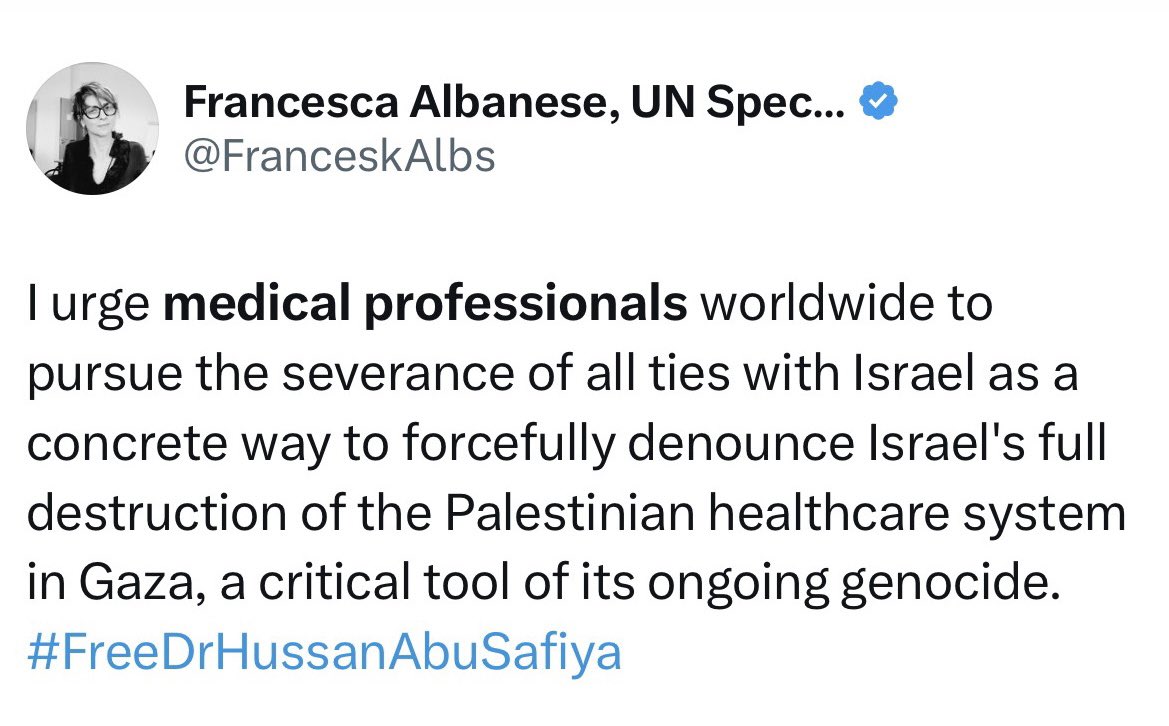 40% of all medical workers in Israel are Arab. About 20% of doctors in Israel are Arab. Does Albanese think we should boycott them, too?