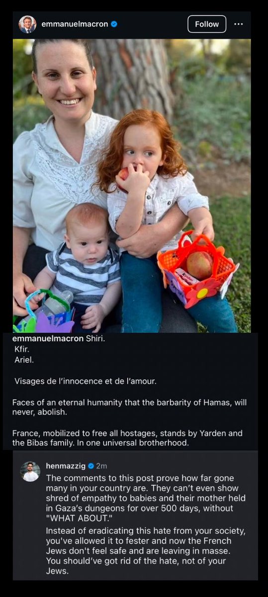 • Hen Mazzig @henmazzig · Twitter · 2025-02-18 20:41 UTC The comments to this post by President Macron prove just how far gone so many in FRANCE 🇫🇷 are… the question is if Macron is going to do anything to fix his country?