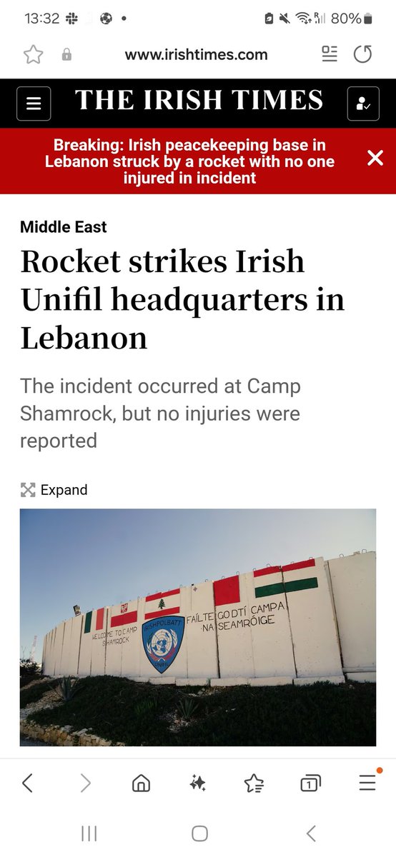 UNIFIL can’t say the word “Hezbollah.” BBC: Ireland’s Gen Clancy said the device that struck Camp Shamrock on Wednesday was a Katyusha rocket. “This was by an armed element, obviously. It was - our assessment - travelling from north to south into Israel.” https://www.bbc.com/news/articles/cqxw9ny2dyeo.amp