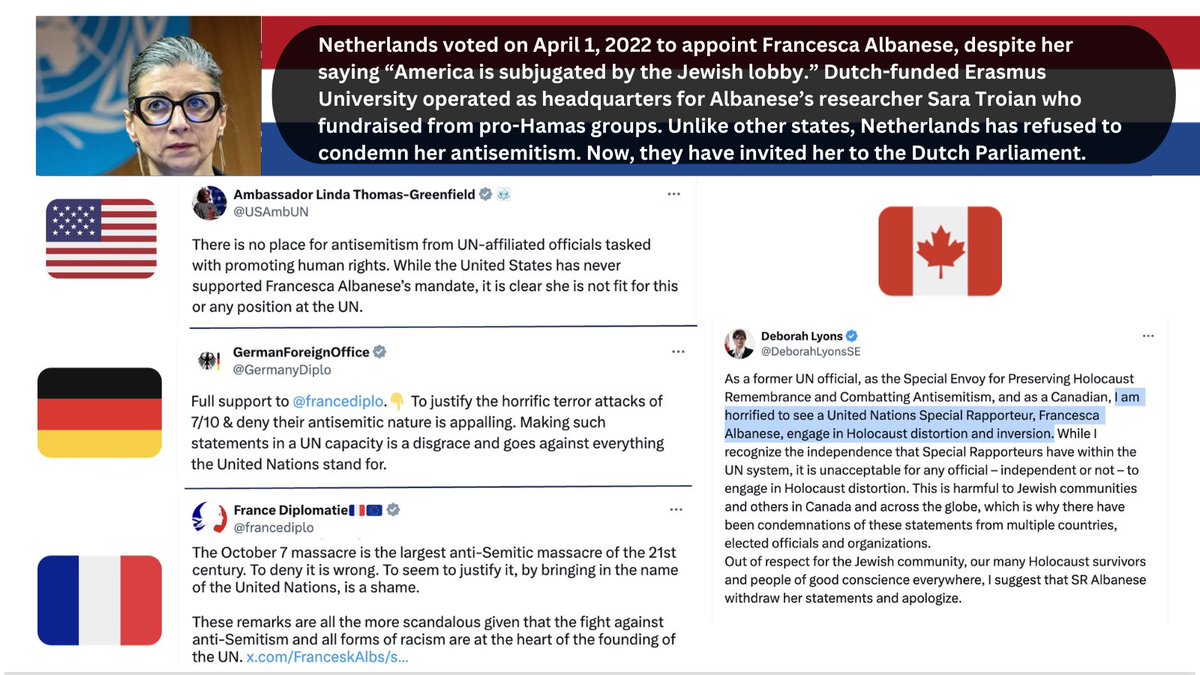 NETHERLANDS BACKS ANTISEMITE: After Germany, France, Canada & US condemned Francesca Albanese for Holocaust distortion & antisemitism, Dutch Parliament invites her for Feb. 13. 🇳🇱 Voted to appoint her in 2022 🇳🇱 Erasmus U. was her fundraising HQ 🇳🇱 Refuses to condemn her racism