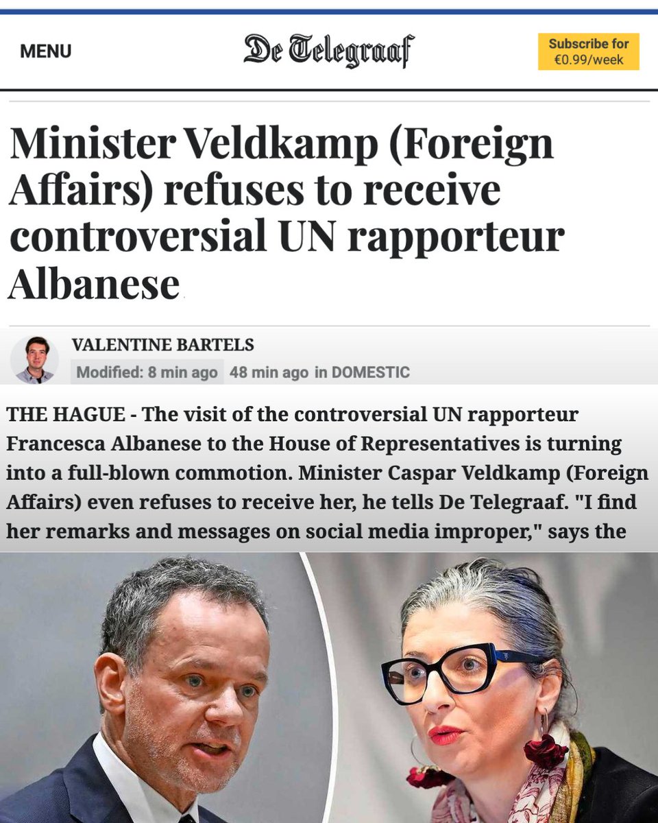 GOOD: 🇳🇱 Dutch Foreign Minister refuses to meet with the U.N.'s Hamas terrorism supporter Francesca Albanese. On the contrary: the Netherlands should arrest her on criminal charges for aiding and abetting war crimes. @WarCrimes_NL, here is the dossier: http://unwatch.org/wp-content/uploads/2024/10/Wolf-in-Sheeps-Clothing-Report-on-Francesca-Albanese.pdf