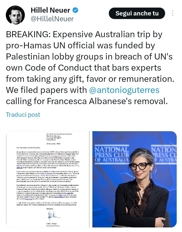 BREAKING: U.N. now acknowledges that Francesca Albanese took “partial external funding for internal trips within Australia and New Zealand.” Previously, she had denied such funding. The pro-Hamas group that sponsored her, AFOPA, eulogized Yahya Sinwar. https://x.com/HillelNeuer/status/1848756221496725555