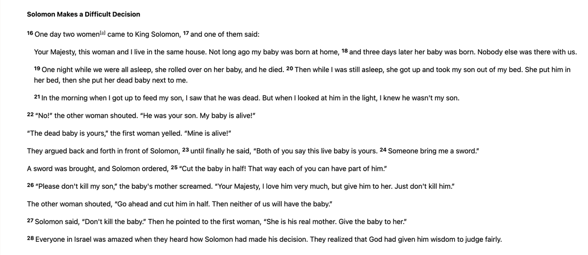 Solomon Makes a Difficult Decision | 1 Kings 3:16-28 One day two women came to King Solomon, and one of them said: Your Majesty, this woman and I live in the same house. Not long ago my baby was born at home, and three days later her baby was born. Nobody else was there with us. One night while we were all asleep, she rolled over on her baby, and he died. Then while I was still asleep, she got up and took my son out of my bed. She put him in her bed, then she put her dead baby next to me. In the morning when I got up to feed my son, I saw that he was dead. But when I looked at him in the light, I knew he wasn't my son. “No!” the other woman shouted. “He was your son. My baby is alive!” “The dead baby is yours,” the first woman yelled. “Mine is alive!” They argued back and forth in front of Solomon, until finally he said, “Both of you say this live baby is yours. Someone bring me a sword.” A sword was brought, and Solomon ordered, “Cut the baby in half! That way each of you can have part of him.” “Please don't kill my son,” the baby's mother screamed. “Your Majesty, I love him very much, but give him to her. Just don't kill him.” The other woman shouted, “Go ahead and cut him in half. Then neither of us will have the baby.” Solomon said, “Don't kill the baby.” Then he pointed to the first woman, “She is his real mother. Give the baby to her.” Everyone in Israel was amazed when they heard how Solomon had made his decision. They realized that God had given him wisdom to judge fairly.