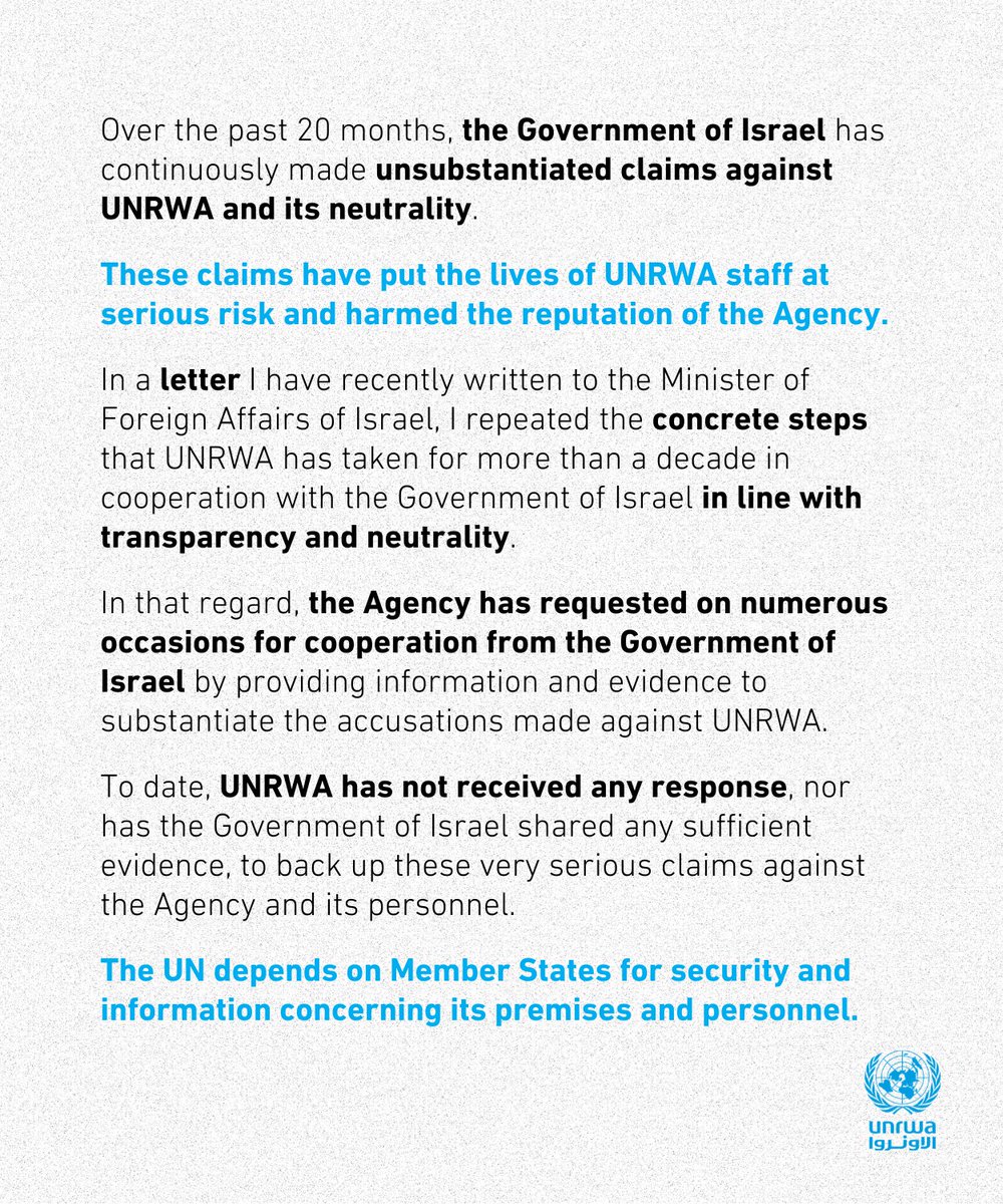 UNRWA has repeatedly requested evidence from the Government of Israel to substantiate serious allegations made against the Agency and its staff. To date, no response has been received. Here are excerpts from a letter by UNRWA Commissioner-General @UNLazzarini urging renewed cooperation, an end to the disinformation campaign, and recalling the responsibilities of Member States. 👇