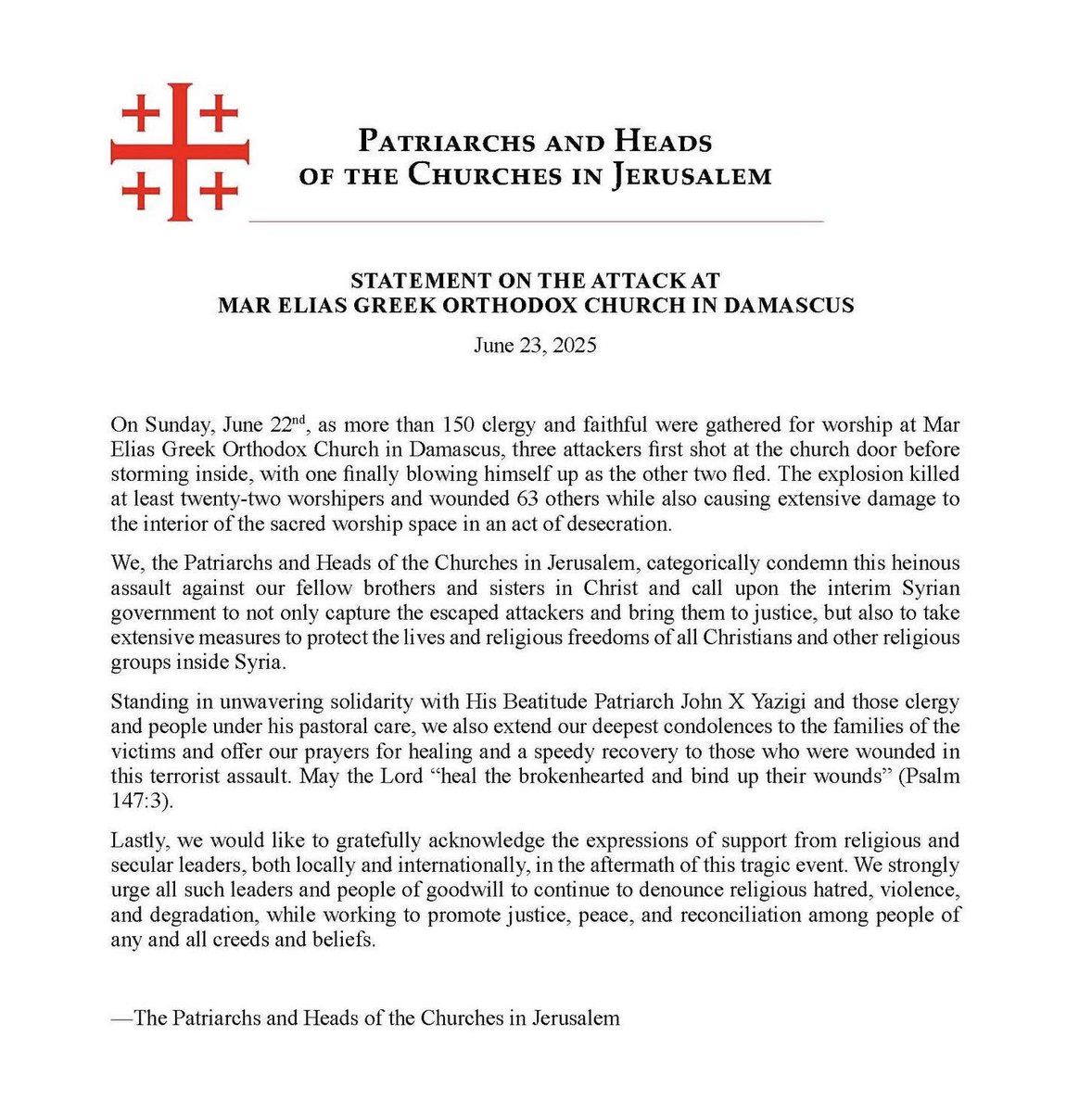 • Ihab Hassan @ihabhassane · Twitter · 2025-06-27 01:28 UTC The Patriarchs and Heads of the Churches in Jerusalem stand in full unity and solidarity with the persecuted Christians of Syria, and strongly condemn the terrorist attack on Mar Elias Church in Damascus.
