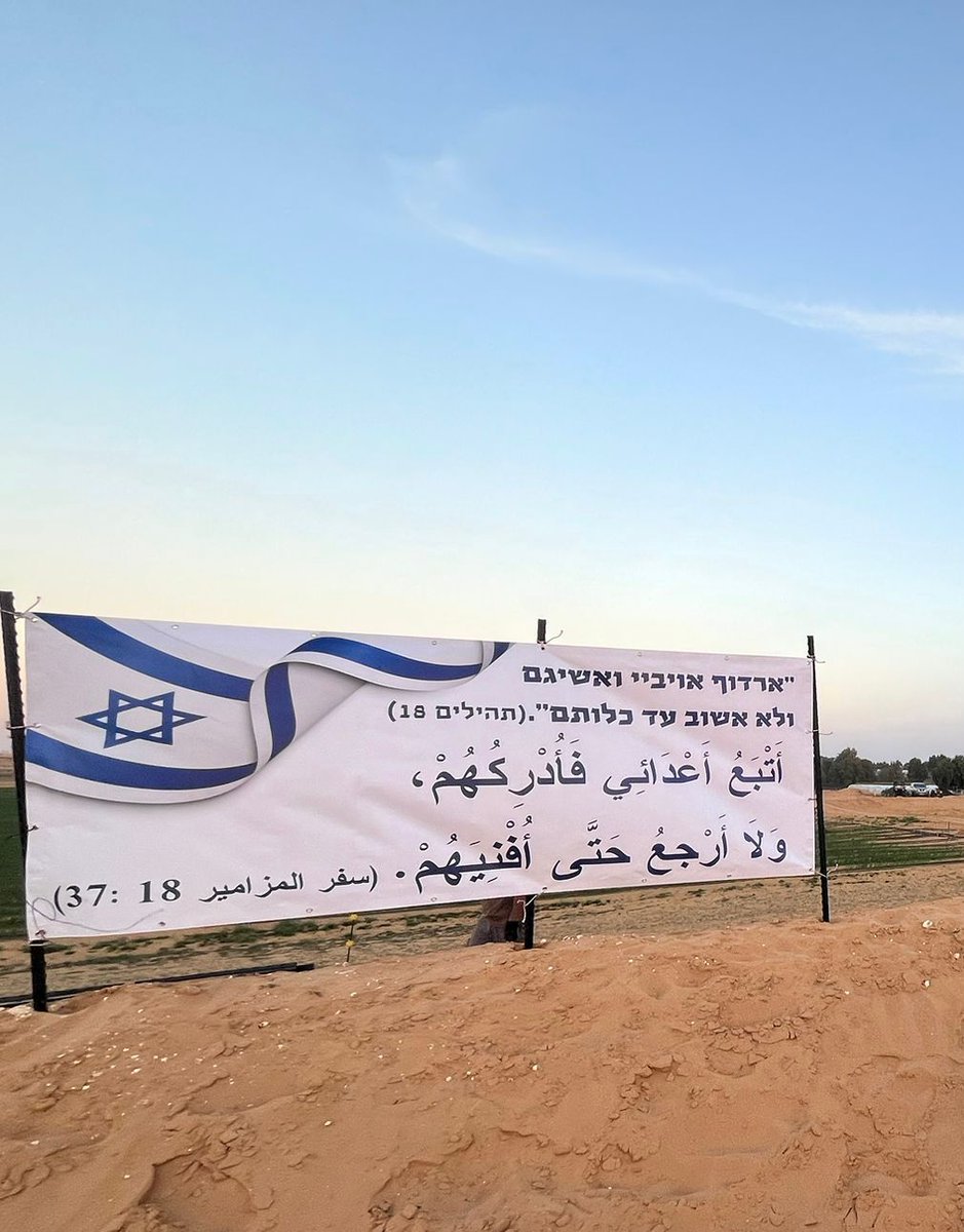 مبادرة رائعة من فلاحين في جنوب إسرائيل 🇮🇱 على الحدود الإسرائيلية المصرية، حيث تمر شاحنات المساعدات لمنظمة حماس الإرهابية والإرهابيين المفرج عنهم الذين تم ترحيلهم إلى هناك - لافتات مكتوب عليها بالعبرية والعربية: "الأرض لإسرائيل، أورشليم لإسرائيل، والله بقوته مع الشعب المختار"، "يحيا شعب إسرائيل" (إعادة صياغة لأغنية يدعي فيها أعداؤنا أن الأرض وأورشليم لهم وأن الله معهم) كما وأضافوا الآية: "أَتْبَعُ أَعْدَائِي فَأُدْرِكُهُمْ، وَلاَ أَرْجعُ حَتَّى أُفْنِيَهُمْ." (سفر المزامير 18 :37)