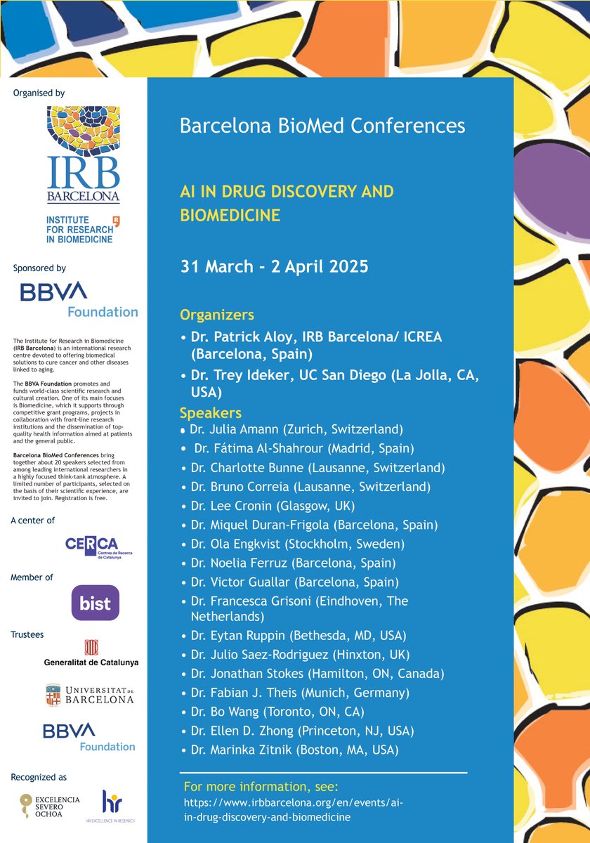 📢Registrations are open for the #BarcelonaBiomed Conference "#AI in #DrugDiscovery & Biomedicine"! 👉31 Mar-2 Apr, 2025 📍Casa Convalescència #Barcelona ✅Organized by @ptck72 (#IRBBarcelona) & @TreyIdeker (@UCSanDiego) 🤝@FundacionBBVA Register now➡️http://rb.gy/ggpjtz