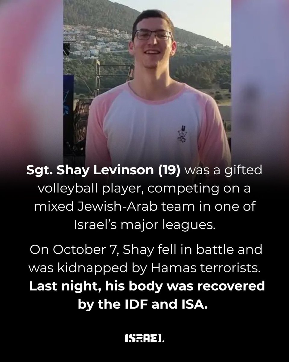 On October 7th, Sgt. Shay Levinson (19) fell in battle and was kidnapped by Hamas terrorists into Gaza. Last night, the IDF and ISA recovered his body. He is finally home.🎗️💔 Shay was an ambitious student and a gifted athlete, playing on an Arab-Jewish volleyball team in Israel’s major leagues. May his memory be a blessing. 🕯️