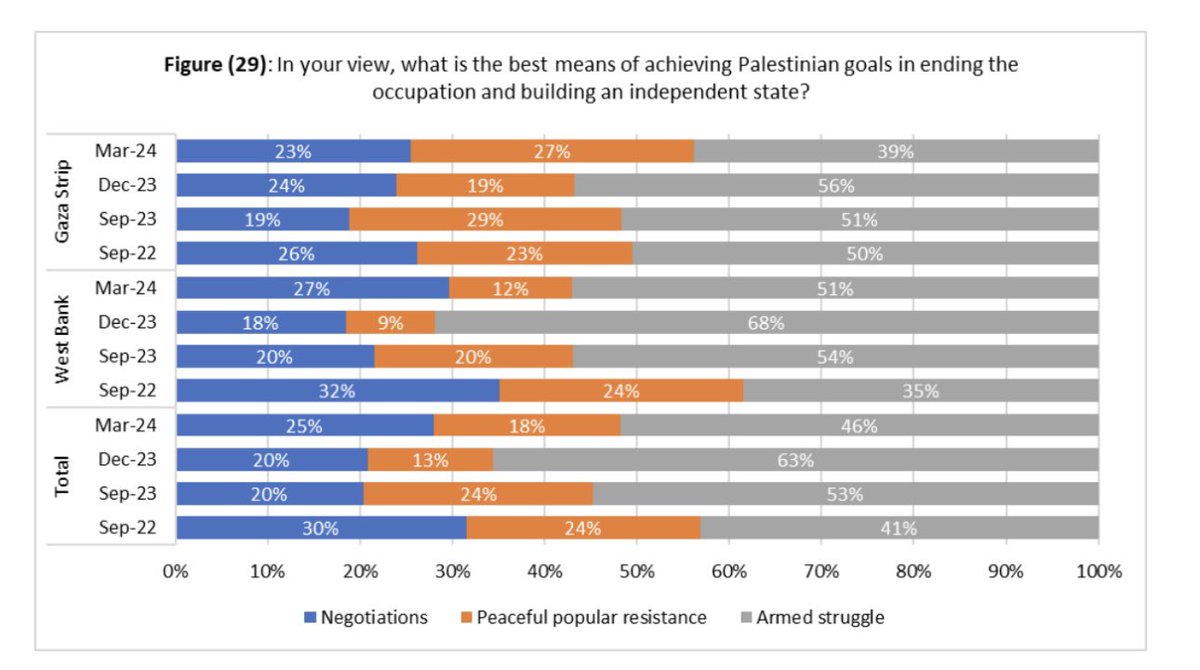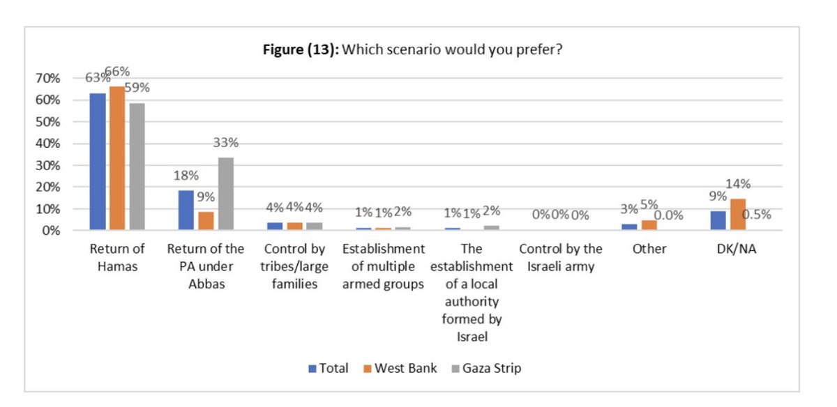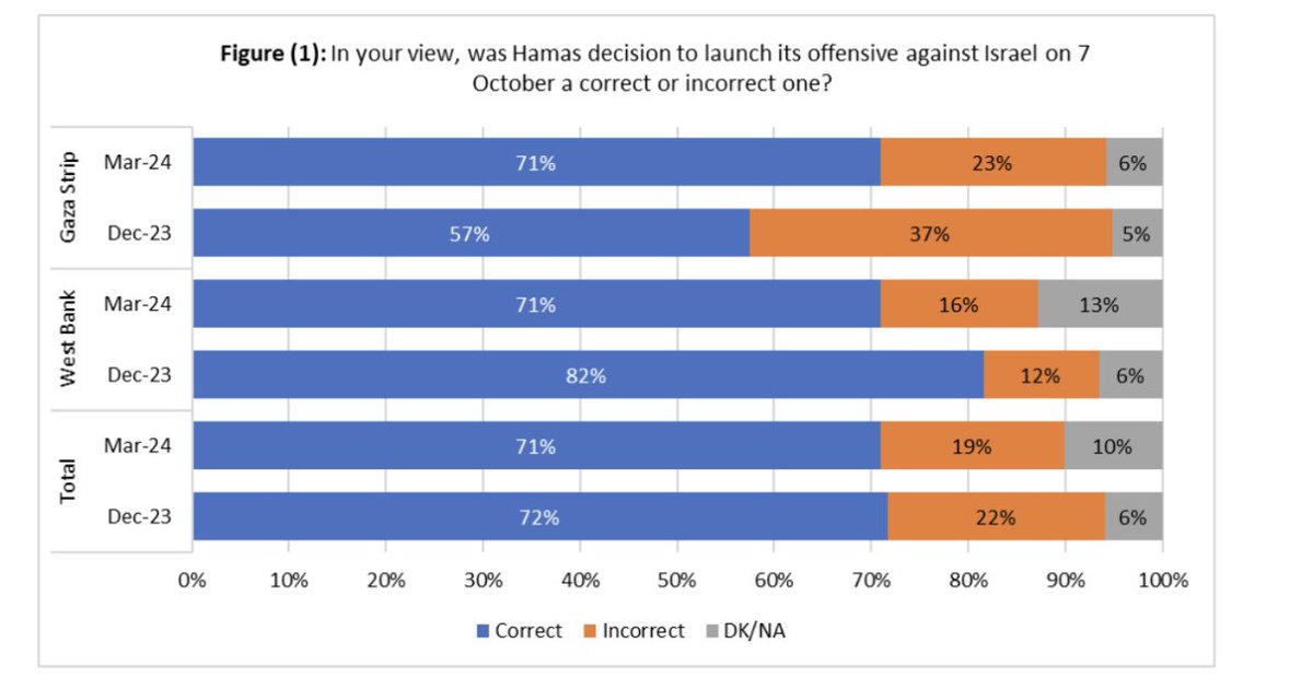 A new depressing Palestinian public opinion poll: 🔴 71% say it was a correct decision to commit October 7 massacre 🔴 81% of those who watched the videos of the massacre said Hamas didn’t commit atrocities 🔴 63% prefer “Return of Hamas” to Gaza 🔴 52% oppose a two-state