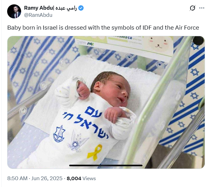 People often discuss the indoctrination of children in Gaza, but Israel begins much earlier—literally from birth. At Assuta Hospital in Ashdod, newborns are dressed in clothing emblazoned with the symbols of the IDF and the Air Force, while just miles away, they perpetrate a genocide in Gaza.