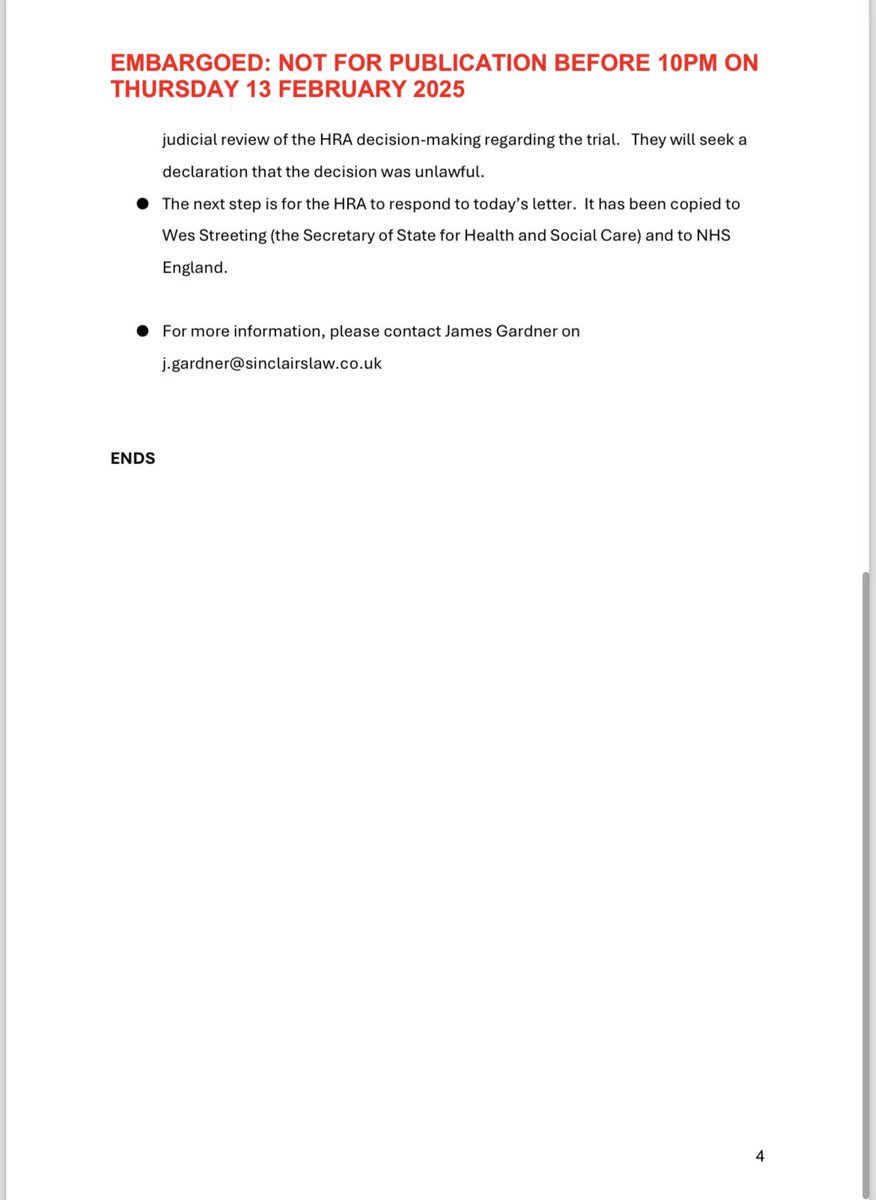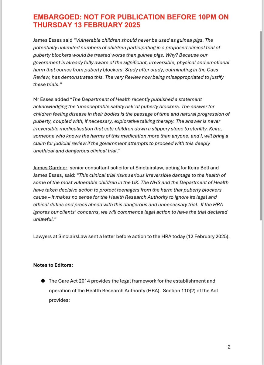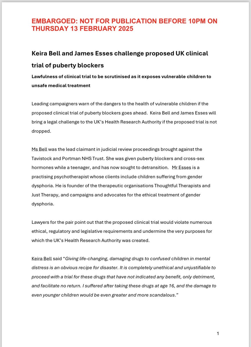 🚨Important Announcement: Keira Bell and James Esses challenge proposed UK clinical trial of puberty blockers🚨 Myself and the indefatigable Keira Bell (@KLBfax) have instructed a legal team to write to the Health Research Authority, warning them that, if the proposed trial goes ahead, we will bring a claim for judicial review. We made this decision because of our joint concerns for the safety of children and the fact that the proposed clinical trial would violate numerous ethical, regulatory and legislative requirements. Full details, along with quotes from myself and Keira, can be found in the below press release.