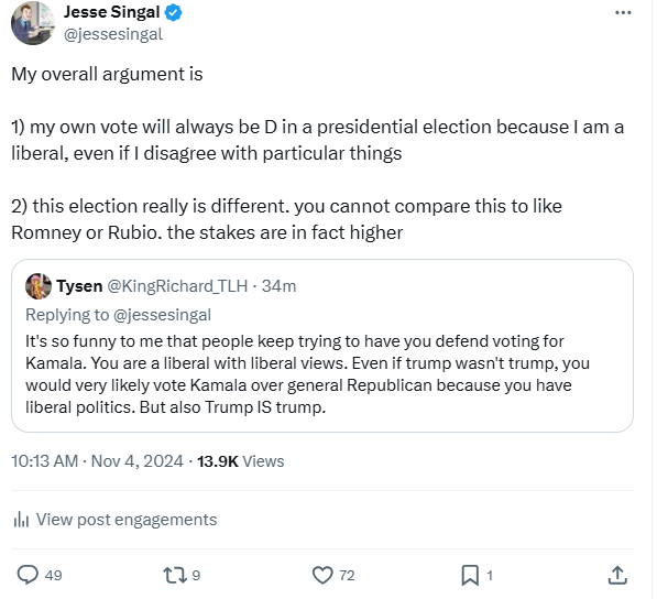 Deleted this because 1) if actually false! Easy to come up with hypotheticals where I don't vote for the D, albeit out-there ones. https://x.com/jessesingal/status/1853461256742564349