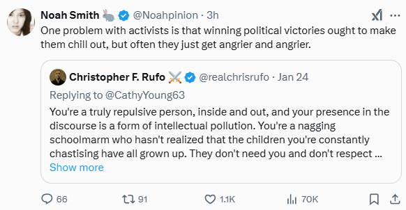 I was thinking along really similar lines the other day. I think the way someone acts when they've won a high-stakes political fight the way Rufo has tells you a lot about them, their movement, or both. He sounds like a cartoon supervillain these days.