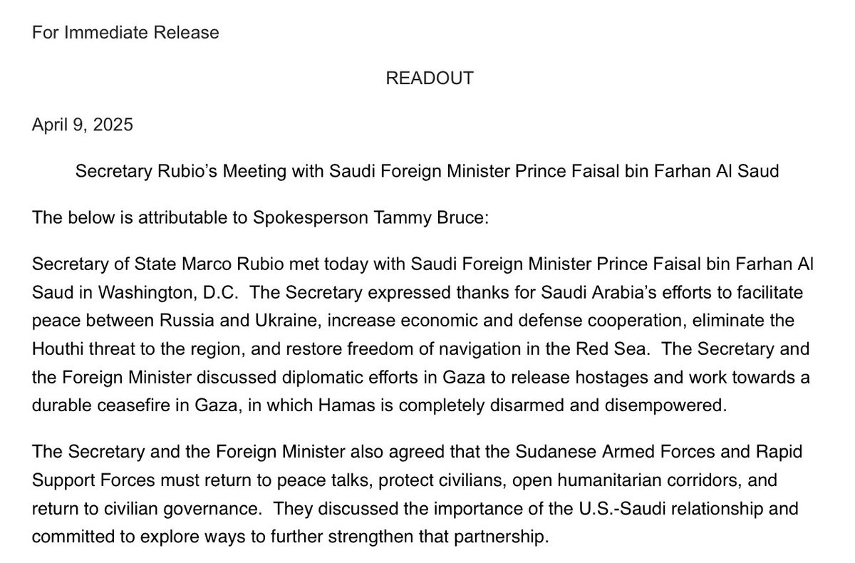 Secretary of State Marco Rubio met today with Saudi Foreign Minister Prince Faisal Al Saud in D.C. Among the subjects discussed were diplomatic efforts in Gaza to release hostages and work towards a durable ceasefire, in which Hamas is completely disarmed and disempowered.