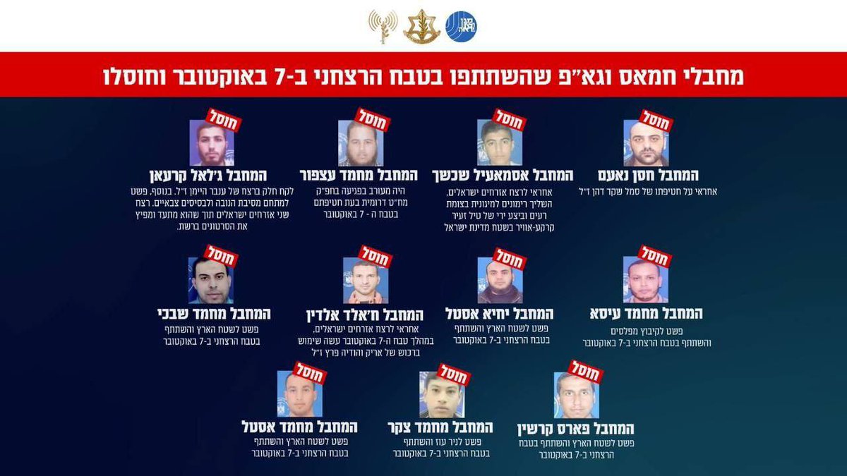 The IDF and Shin Bet announced the elimination of 11 terrorists who infiltrated Israel and took part in the October 7, 2023 massacre. These individuals were involved in the murder and kidnapping of Israeli civilians and soldiers. Operation Details: The joint operation began on March 18, 2025 in the Gaza Strip, led by the Southern Command with support from the Intelligence Branch and Air Force. Nine terrorists were killed during the operation. Two additional terrorists were eliminated in earlier targeted strikes. Notable Terrorists Eliminated: Hassan Na'em – kidnapped Sergeant Shaked Dahan. Ismail Shakash – murdered civilians, threw grenades, and fired a missile. Jalal Qaraan – murdered and documented killings, raided civilian and military sites. Muhammad Issa, Muhammad Shabaki, Fares Kershin, Yahya Estelle, Muhammad Zakar, Muhammad Astel – all participated in the October 7 massacre, including raids. Previously eliminated: Muhammad Atsfur – attacked Israeli forces during the October 7 kidnappings. Khaled Al-Din – murdered civilians and used the victims' property during the attack.