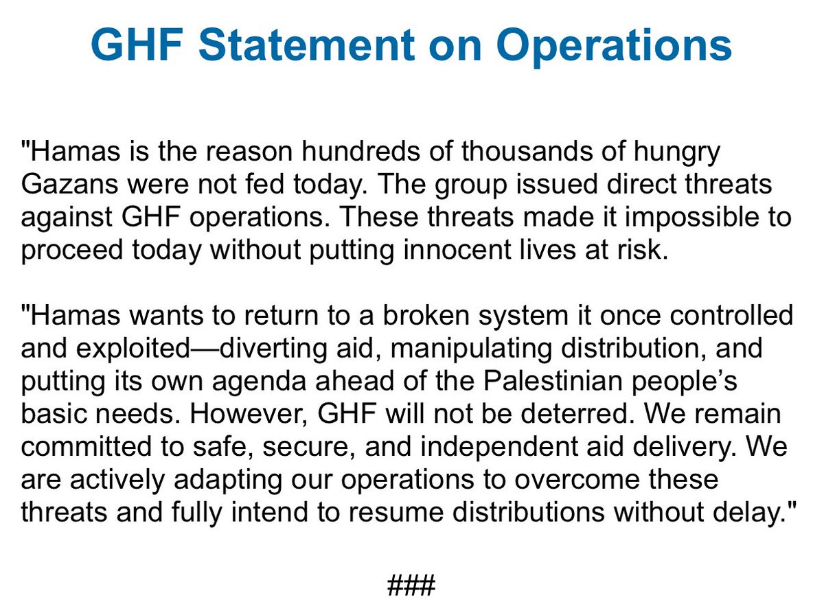 GHF expects and demands statements of condemnation from the world in response to these threats, which only further hurt Gazans. You don’t have to agree with our approach to delivering aid to condemn this profane attempt to keep Gazans from getting food. June 7 Statement ⬇️