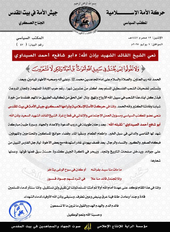 The Army of the Ummah, a small jihadist organization in Gaza, issued a statement mourning the death of Commander Ahmed al-Sidawi, who was killed by an Israeli airstrike in recent days. --- Statements from jihadist groups in Gaza have become a rarity these days.