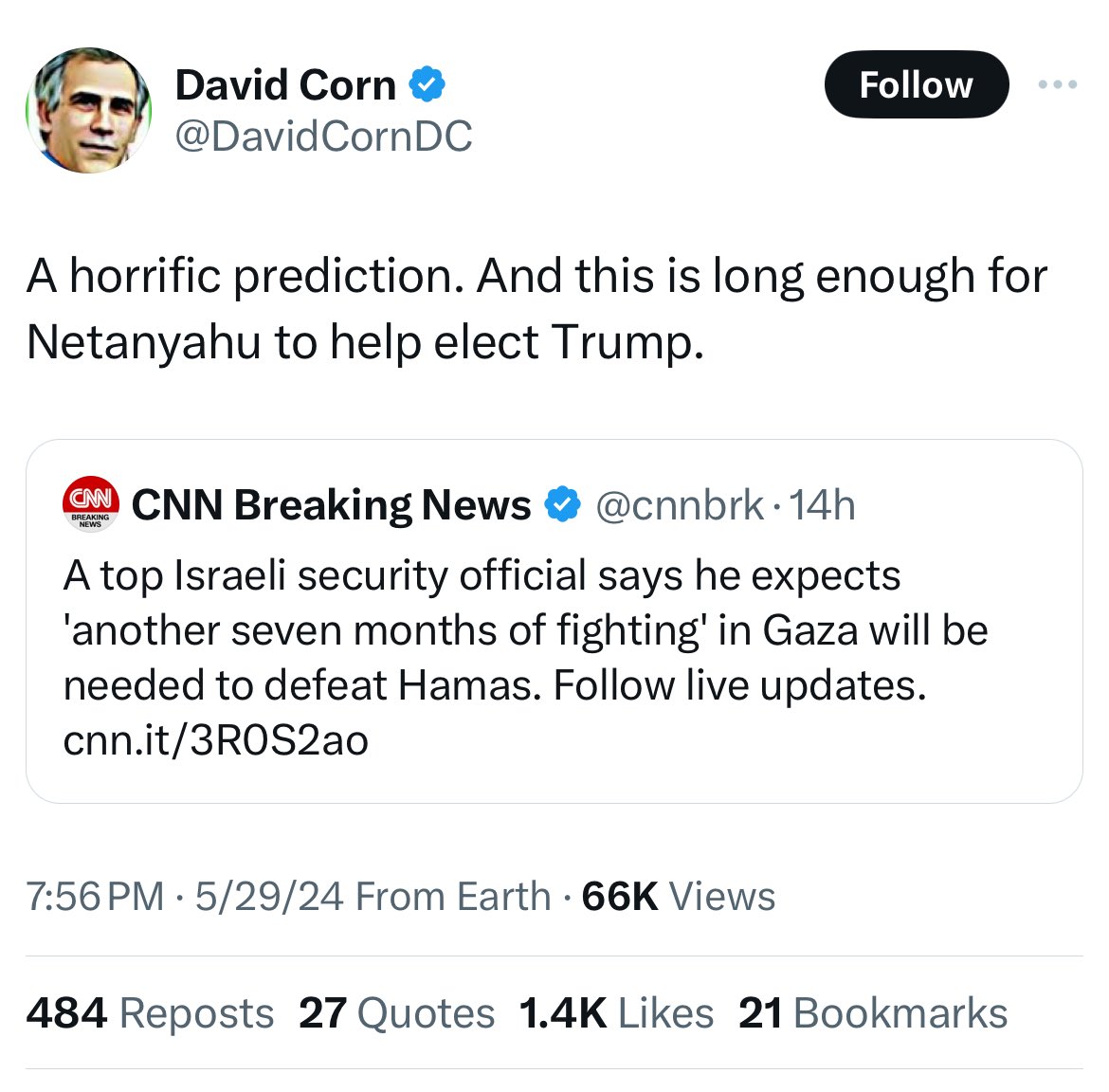 • Lahav Harkov @lahavharkov · Twitter · 2024-05-30 05:41 UTC Listened to several minutes of the hosts of Israel’s most popular news radio station talking about this prediction this morning and neither Trump nor Biden came up once. But for some Americans, everything is about America.