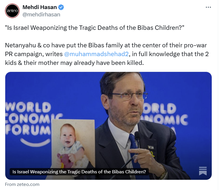That Mehdi is a sick antisemite, we know. But the supposed debating master also undermines his own point. "The 2 kids & their mother may already have been killed," he writes. MAY. We don't know with any certainty and Hamas refuses to give any information. The fight continues.