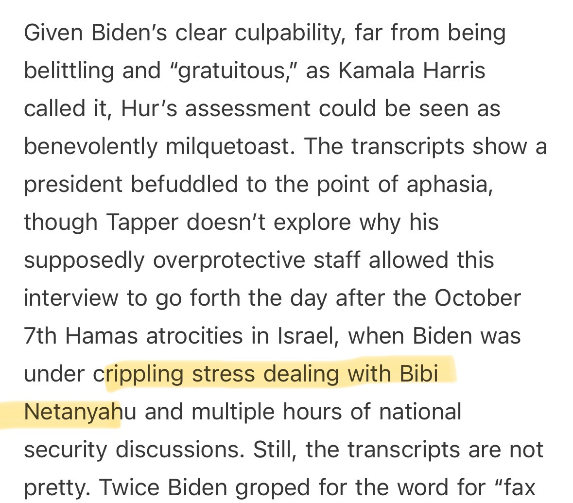 Lahav Harkov @lahavharkov · Twitter · 2025-05-27 06:19 UTC Tina Brown found the culprit for why Biden sounded so bad in the Hur tapes. Bibi! Of course. It’s always Bibi.