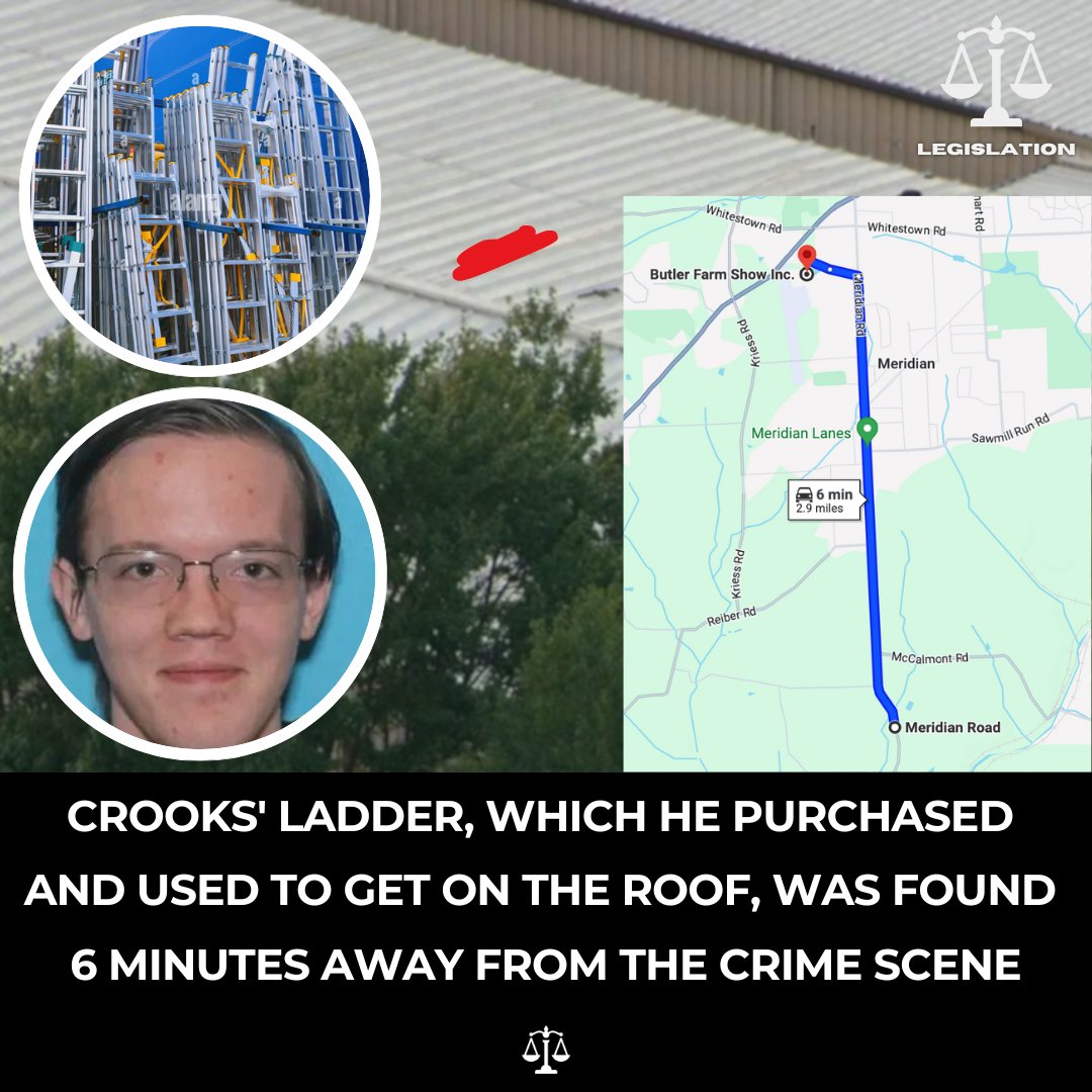 𝐁𝐑𝐄𝐀𝐊𝐈𝐍𝐆: Crooks' ladder, which he purchased prior to the shooting, was NOT FOUND at the Butler Farm Show where the shooting took place... Instead, it was found about 5 minutes from the scene on Meridian Road, along with his backpack containing a drone... The FBI Director publicly stated that the ladder was NOT FOUND at the crime scene, making it unknown how Crooks got on the roof.... How did the ladder get there and who helped Crooks? Source: @TheAustinAyers