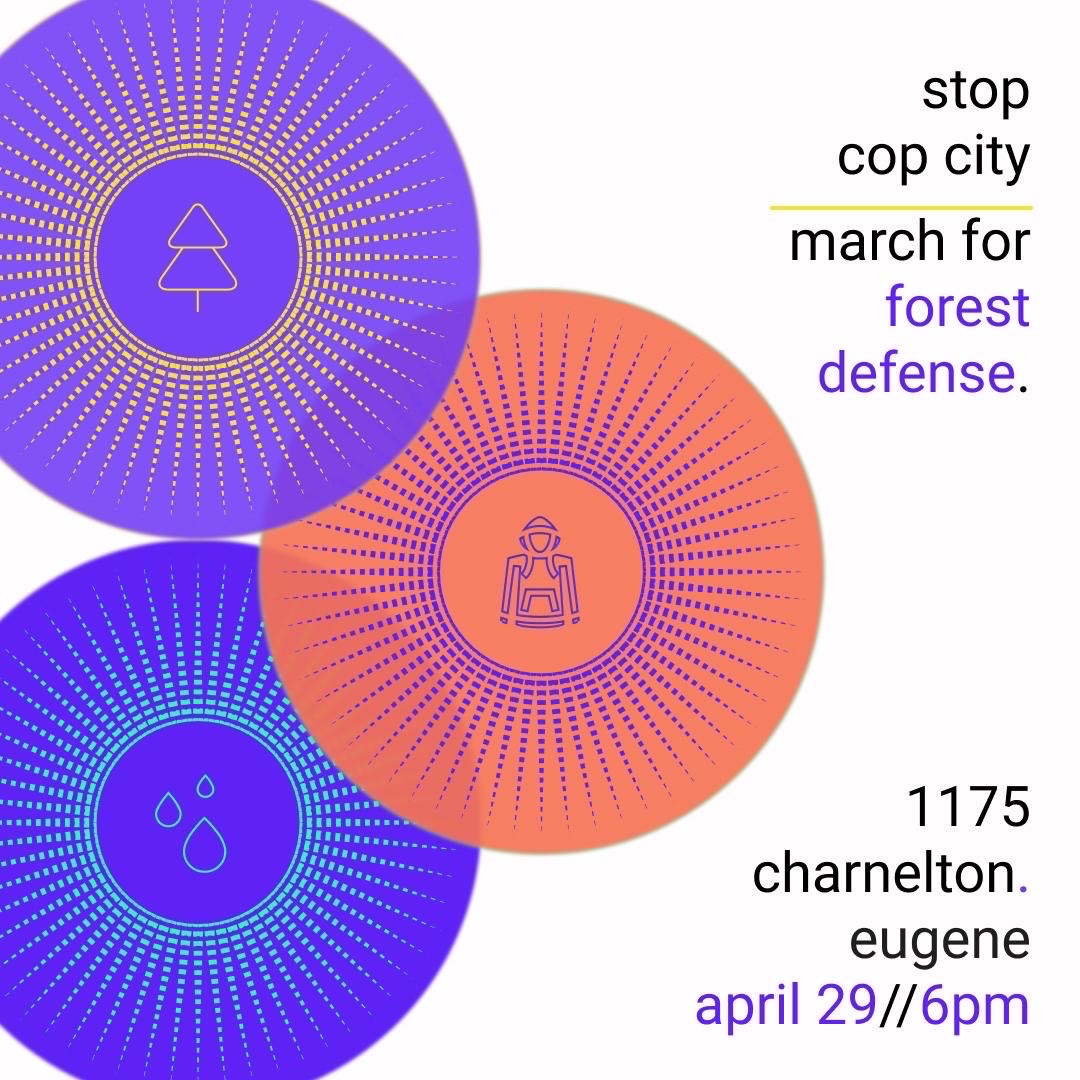 We are calling on our friends and supporters to meet in the streets of #Eugene, Saturday April 29th at 6pm, in solidarity with Atlanta Forest Defenders and the movement to Stop Cop City. Bring a friend, bring a vibe. Reality is the battlefield. #LetsGoEugene #StopCopCity