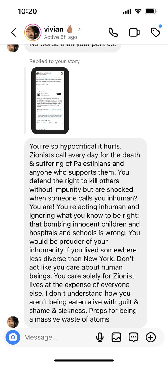 “You’re so fucking delusional. Full blown fascist and brainwashed piece of shit… your entitlement is astounding.” “Props for being a massive waste of atoms.” These are the direct messages I received from a peer @Columbia on October 7th. Welcome to the life of a Jewish student.