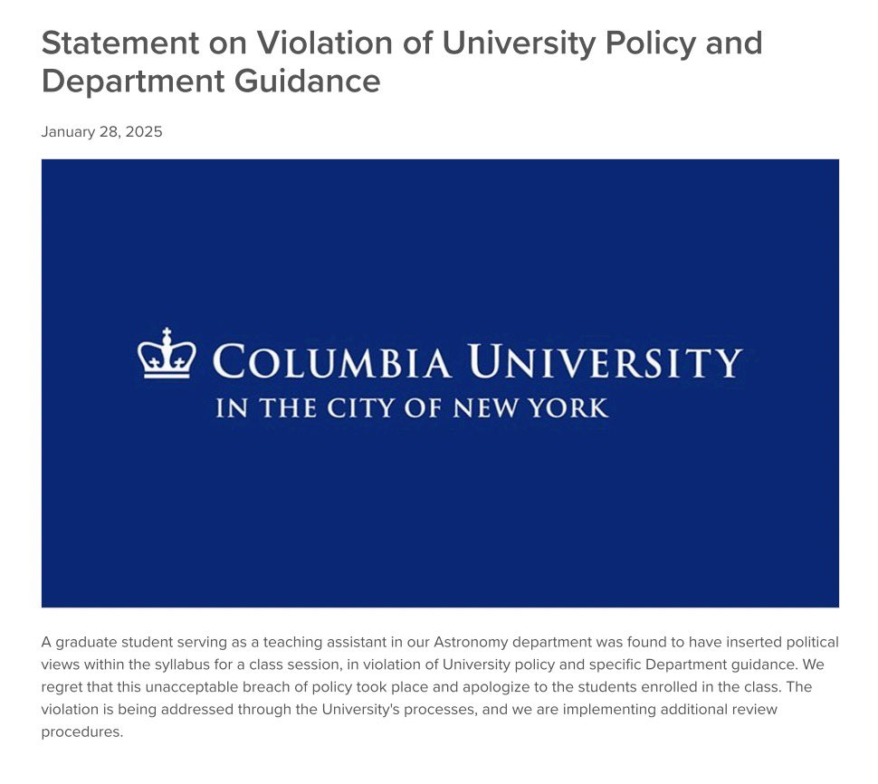Update @Columbia Bad: An astronomy TA went rogue and inserted his political agenda into a syllabus Good: @Columbia apologized and announced that the incident is being addressed Assuming the TA is disciplined, this is exactly what should happen in these situations