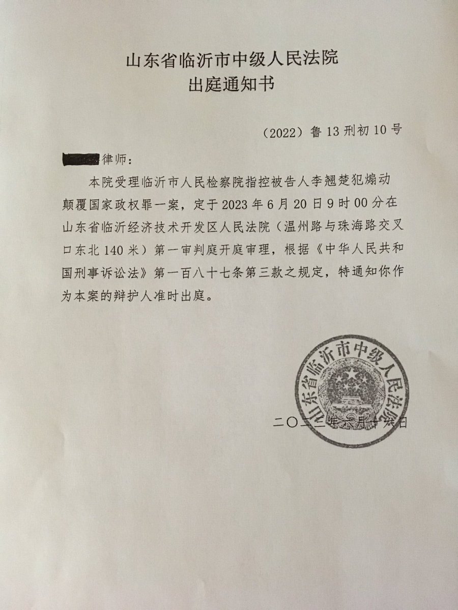 Luo Shengchun丁家喜律师妻子 @luoshch · Twitter · 2023-06-18 16:22 UTC #关注李翘楚 2023年6月18日李翘楚案辩护律师收到山东省临沂市中级人民法院通知, 李翘楚煽动颠覆国家政权罪一案,定于 2023年6月20日9时在 山东省临沂经济技术开发区人民法院第一审判庭开庭审理。(2022)鲁13刑初10号,翘楚母亲被告知该案是不公开审理,她申请庭审后和翘楚见面但遭办案单位拒绝。