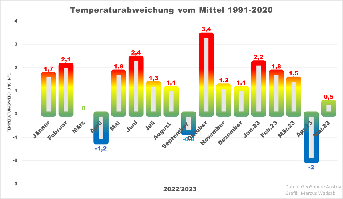• Marcus Wadsak 🌞 @marcuswadsak · Twitter · 2023-05-08 09:29 UTC kaum zu glauben: die erste Mai-Woche war um ein halbes Grad wärmer als der Schnitt der rezenten Klimanormalperiode. Im Vergleich mit 1961-1990 liegen wir sogar gute 2 Grad über Schnitt: