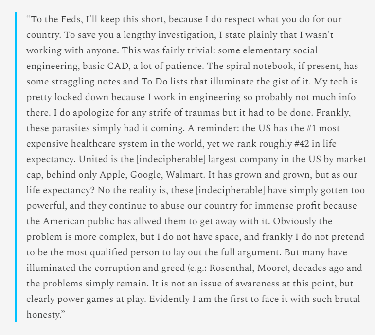 🚨🇺🇸LUIGI MANGIONE’S MANIFESTO REVEALED: "THESE PARASITES SIMPLY HAD IT COMING" @kenklippenstein has obtained the 262-word manifesto of Luigi Mangione, accused of killing UnitedHealthcare CEO Brian Thompson. Unlike the forgery circulating online, this is reportedly the real document. Mangione claims he acted alone, citing frustrations with the U.S. healthcare system’s costs and corporate power. He called the act “brutal honesty,” targeting what he describes as “parasites” exploiting the American public. Major outlets have declined to publish the manifesto in full, selectively quoting it without explanation. Klippenstein promises further analysis on the media’s handling of such disclosures. Source: Ken Klippenstein
