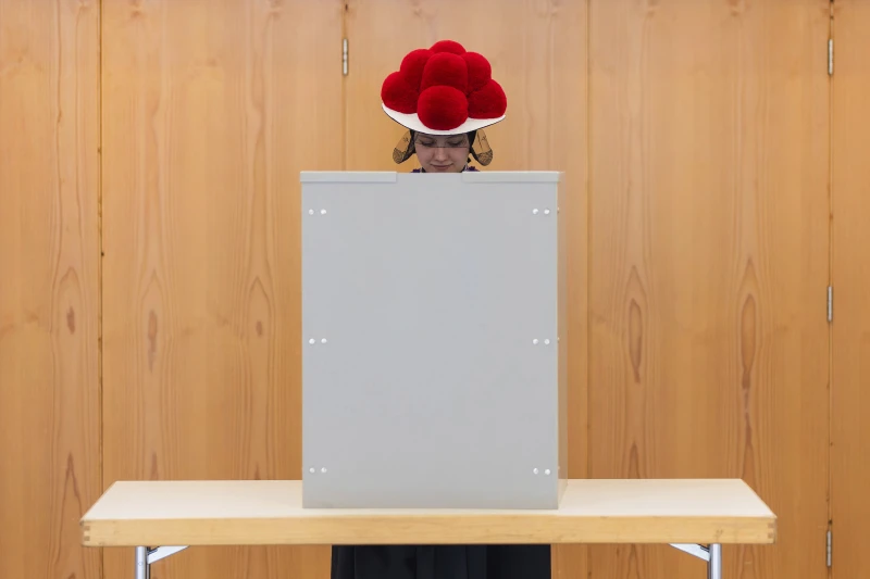 🚨🇩🇪GERMAN VOTER CASTS BALLOT IN TRADITIONAL BLACK FOREST COSTUME A woman wearing a traditional Bollenhut hat and Black Forest attire was spotted voting in Gutach during Germany’s national election. The iconic red pom-pom hat symbolizes local heritage, blending tradition with democracy at the polls. Source: AP