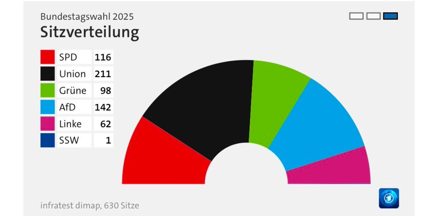 🚨🇩🇪CONSERVATIVE CDU WINS BIG, AfD SURGES—GERMAN PARLIAMENT SEAT PROJECTIONS Exit polls show CDU leading with 211 seats, while the AfD surges to 142, becoming Germany’s second-largest party. Scholz’s SPD collapses to 116 seats, Greens at 98, and The Left at 62. Coalition math: -CDU + SPD = 327 (majority) -CDU + Greens = 309 (short of 316 seats) Germany’s political landscape has shifted—coalition talks will decide the future. Source: @visegrad24