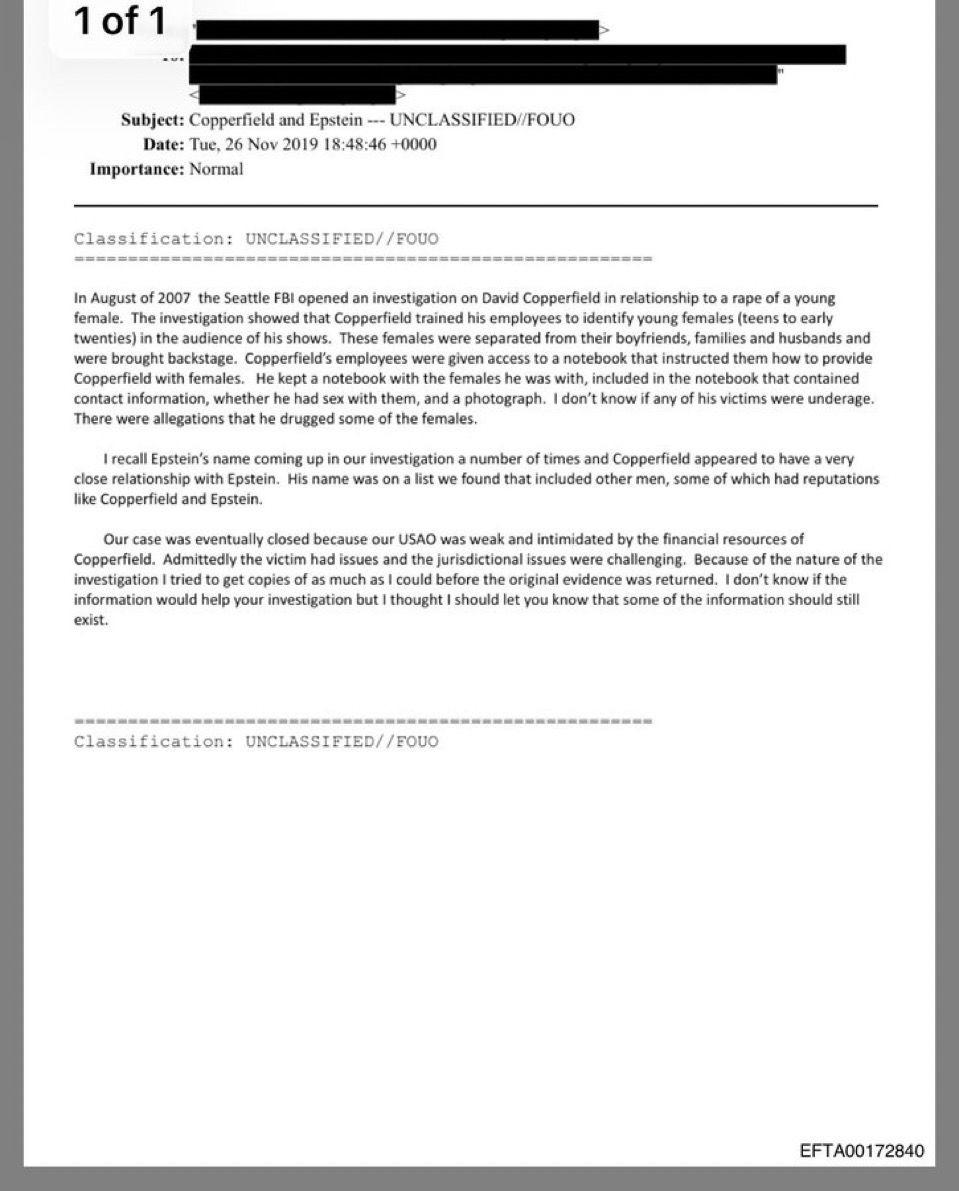 Epstein files say David Copperfield gave show tickets to girls Epstein abused. The FBI opened a case, but prosecutors dropped it. Why? Because they were scared of his money. Not making this up, read the email below: “Our case was eventually closed because our USAO was weak and intimidated by the financial resources of Copperfield.”