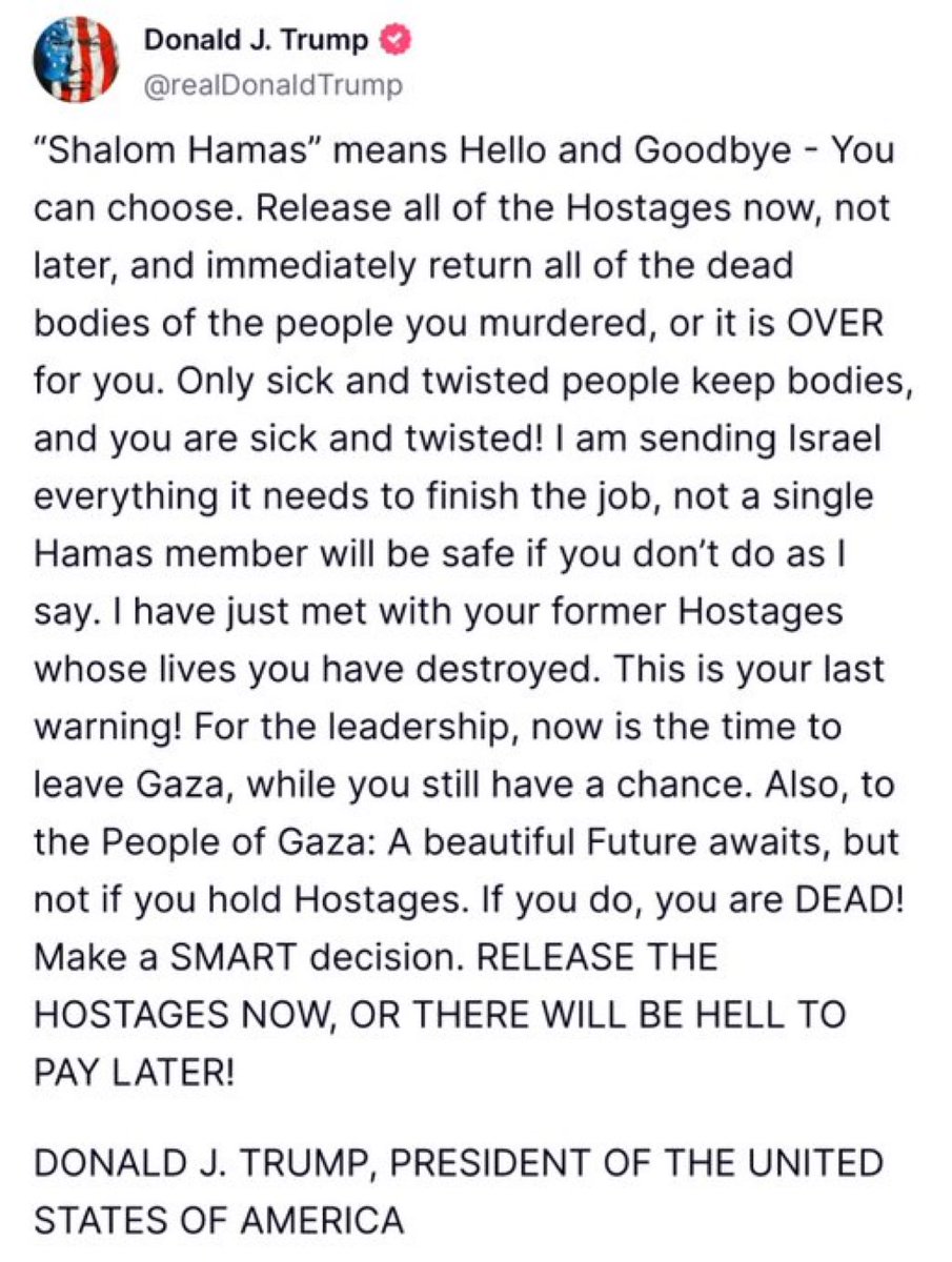 If only Joe Biden had the spine to have posted years ago what Trump posted today perhaps many hostage lives could have been saved. This is the ultimatum that terrorists should always be given when they take hostages and keep even dead bodies as hostages.
